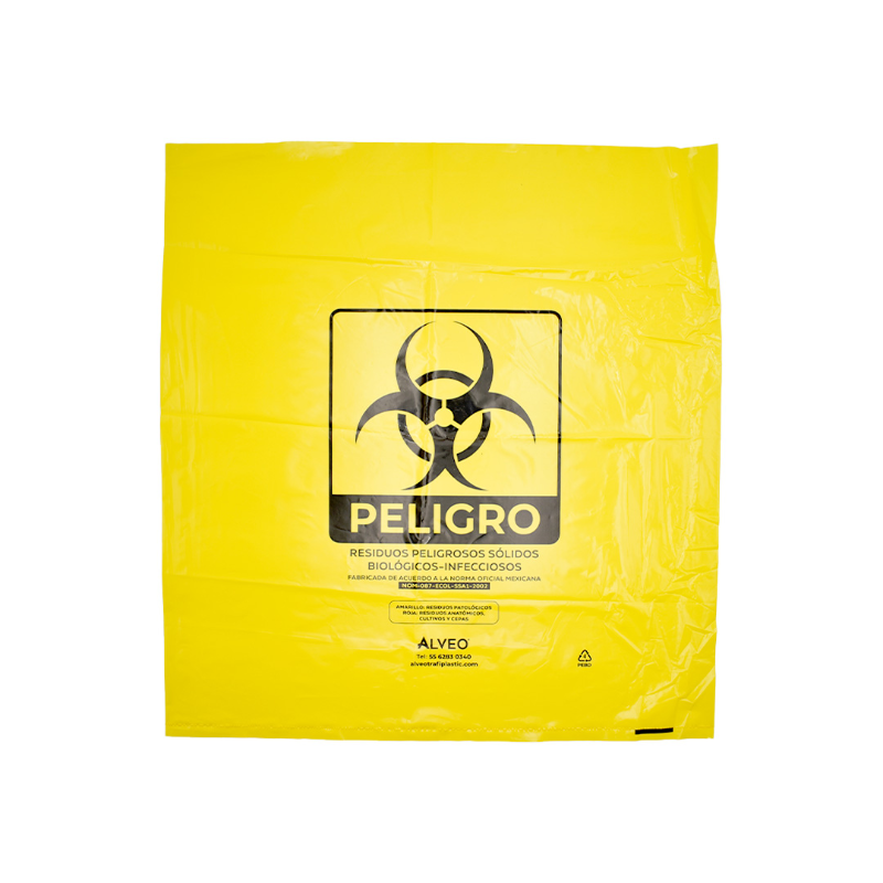 Bolsa de polietileno de baja densidad, libre de metales pesados para la recolección de residuos biológico infecciosos. Carga Máxima: 8 kg. Impresa a una tinta con logotipo de biológico infeccioso. Calibre 300. Con fuelles. Medidas: Ancho: 55.0 cm. Alto: 60.0 cm. Color: Amarillo.